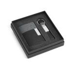 Комплект с визитник и ключодържател. И двата продукта са от полиуретан и метал. Доставят се в подаръчна кутия. Ключодържател: 15 x 92 x 8 мм | Картодържател: 97 x 65 x 11 мм | Кутия: 154 x 143 x 34 мм