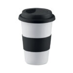 Едностенна керамична чаша със силиконов капак и лента за обвиване. Капацитет 400мл. Керамичният трансфер може да се мие в съдомиялна машина. Тъй като това е чаша с една стена, все още може да възникне пренос на топлина.