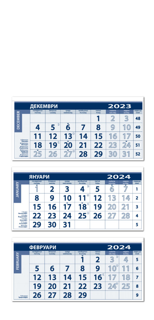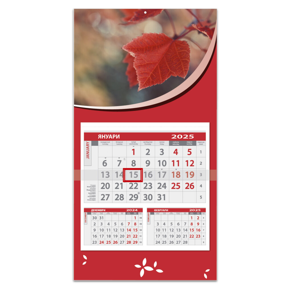 Този календар е идеален за печатници и рекламни агенции, които желаят да персонализират продукта според изискванията на своите клиенти. Тялото включва три отделни секции с отбелязани празници, именни дни и фази на Луната, отпечатани с двуцветен печат върху 70 г/м² офсетова хартия. Основата е изработена от бял картон Зенит (315 х 485 мм), готова за добавяне на персонализирана глава. Прозорчето за дати в червен цвят е включено в цената.