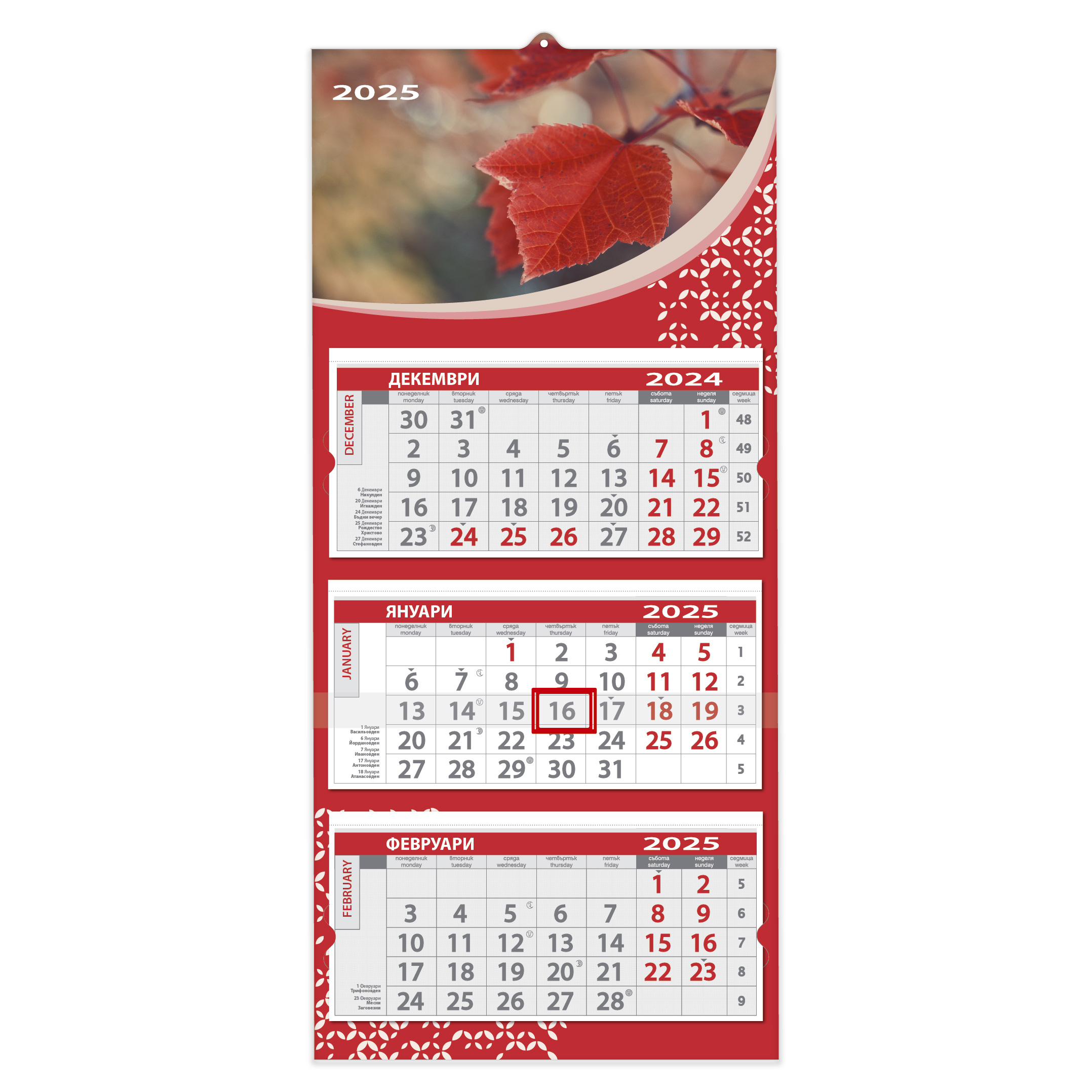 - Тяло – 3 отделни секции с отбелязани празници, именни дни и фази на Луната, декоративни шапки и перфорация, 2 цвята печат, хартия – 70 гр./м2 офсет. Цветове – син, светло син, червен, зелен и жълт.
