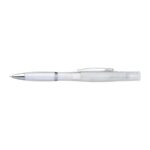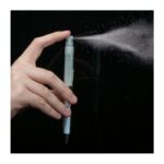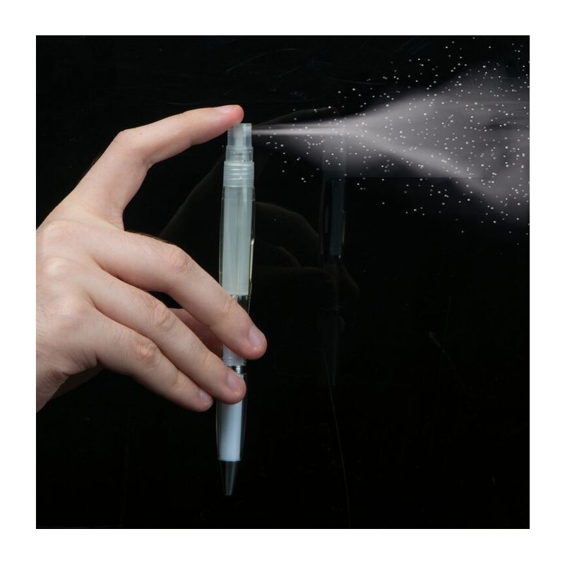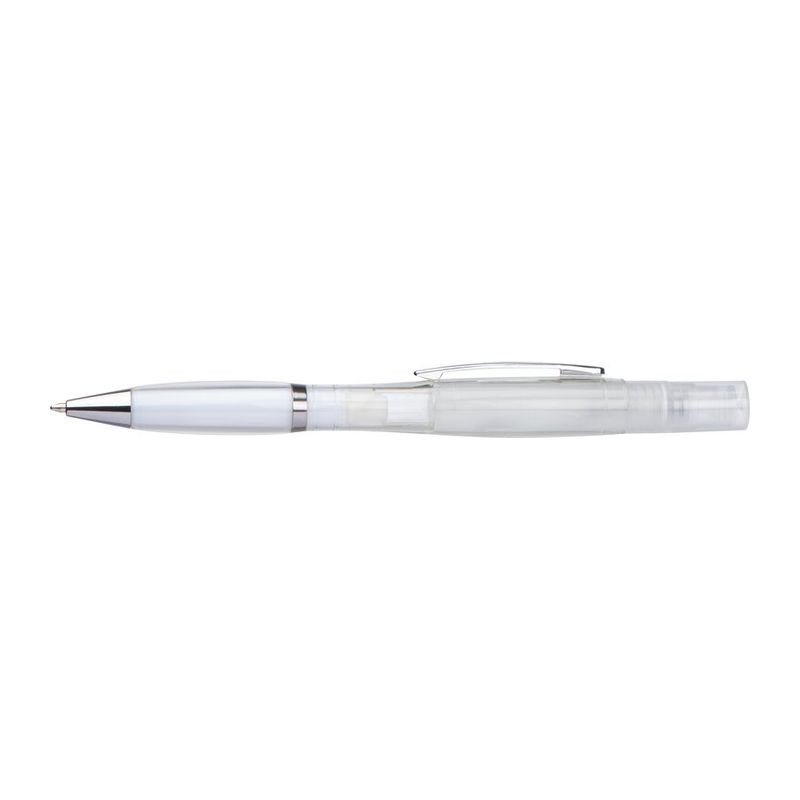 Полупрозрачен Twistpen със сребърни апликации и пълнител със син надпис. Пръскачката може да се пълни многократно – идеална за парфюми или дезинфекционни течности.