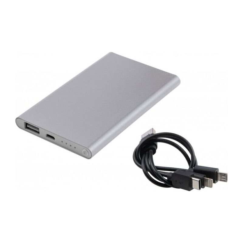 Алуминиева външна батерия с капацитет за зареждане от 4000 mAh, индикатор за зареждане, кабел за зареждане с няколко щепсела (светкавица, USB Type C и Micro-USB).