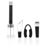 Имате всичко необходимо, за да отваряте, сервирате и съхранявате любимите си вина с този комплект за вино от 4 части. Комплектът се състои от отварачка за вино с въздушна помпа, резачка за фолио, тапа за вино с вакуумна помпа и наливащо устройство за вино с аератор. Опаковани в луксозна подаръчна туба.