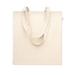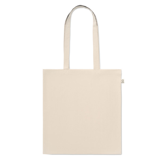 Пазарска чанта от рециклиран памук преди употреба (70% рециклиран памук и 30% RPET) с дълги дръжки.