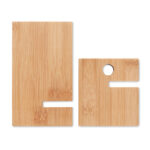 Бамбукова стойка за телефон. Включва 2 части, можете да го сглобите вертикално, за да държите телефона си. Бамбукът е естествен продукт, възможно е да има леки вариации в цвета и размера на артикул, което може да повлияе на крайния резултат от декорацията.