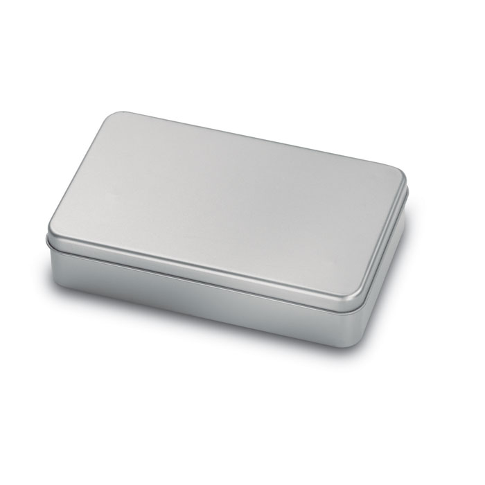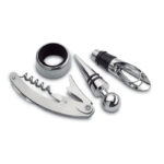 Комплект за вино, включващ отварачка за бутилки, запушалка, наливащо устройство и пръстен против капене, представен в тенекиена кутия.