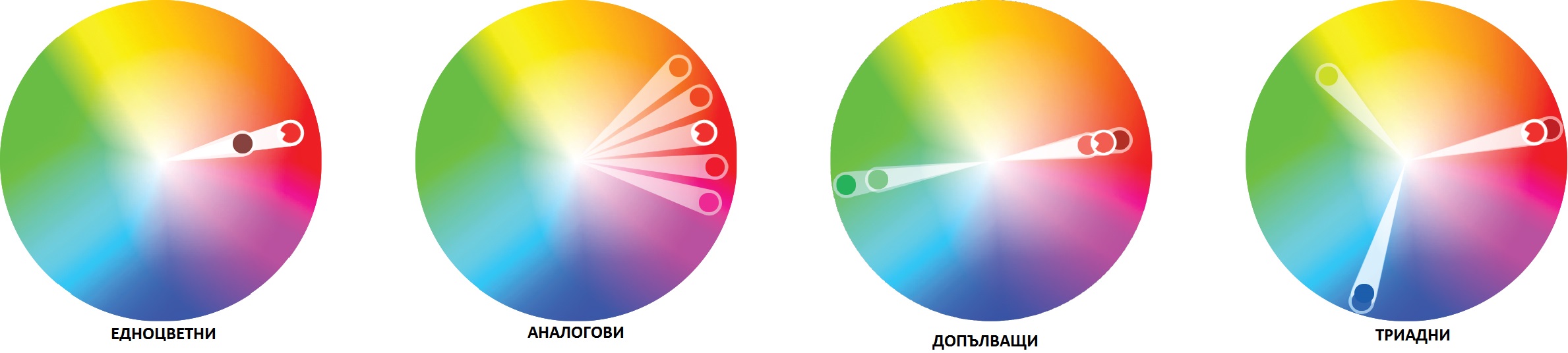 Какво представляват:  Аналогични са групата цветове, които са съседни на колелото на цветовете. По-горе сме дали пример за цветовата палитра с нюансите на лилаво, червено, оранжево- всички в едно и също „тримесечие“ на колелото.
